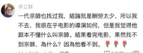 因为看清了王家卫的真实面目,向太毫不猶豫地说:绝对不考虑录用。紧接着,老资格的演员李立群也透露,说当年《一代宗师》邀请他时,他就拒绝了,原因是他觉得王家卫根本不懂什么是真正的宗师。等电影出来后,事实也验证了这一点,至少李立群自己这么觉得,他在影片中也没有找到答案。